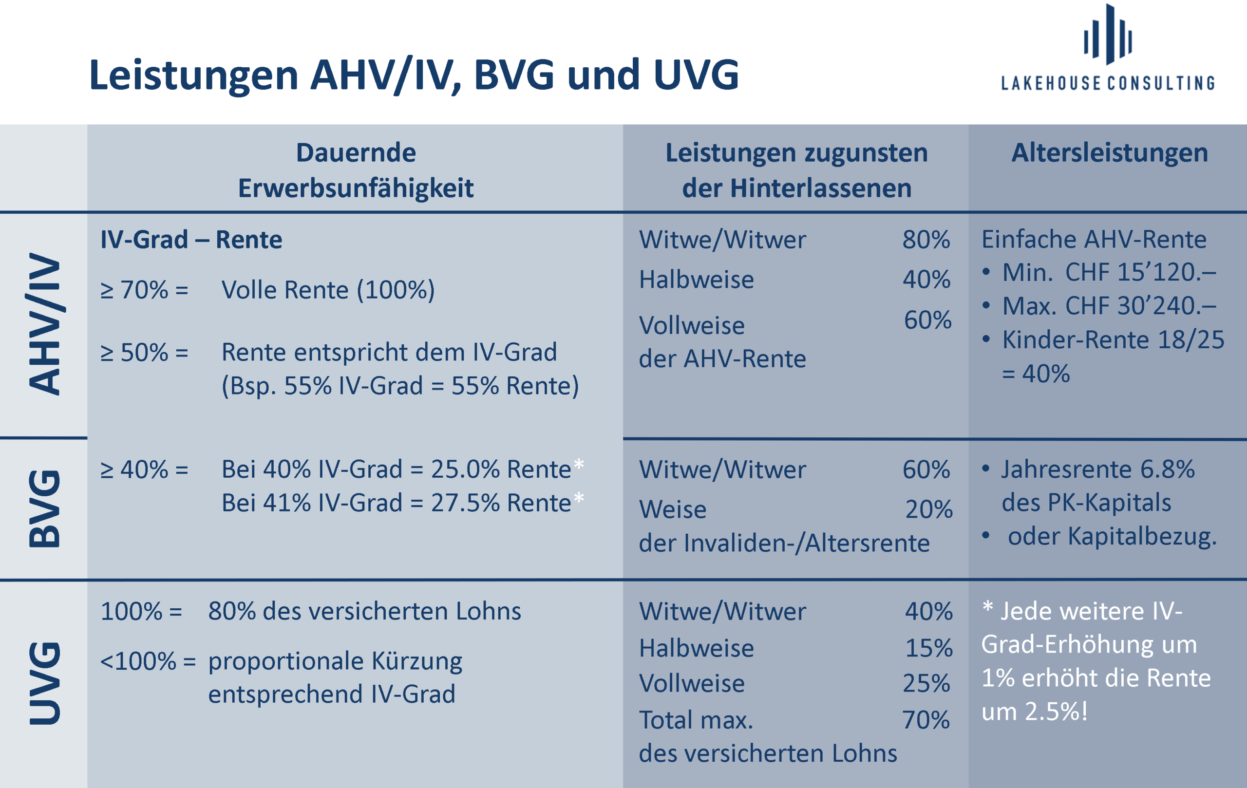 Die Grafik zeigt einfach und übersichtlich, wieviel Leistungen für wen von welchen Vorsorgeeinrichtung ausbezahlt werden.